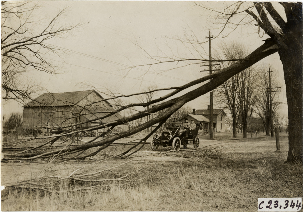 View of motorists in E-M-F car approaching downed tree limb on rural dirt road during the pathfinding expedition for the 1909 Glidden Tour. Barn and farmhouse in background. Handwritten on back: "Tours--Glidden Tour Pathfinder, 1909."