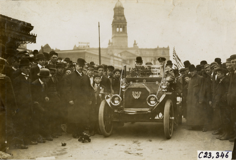 Crowd surrounding motorists in E-M-F automobile at Detroit, Michigan, 1909 Glidden pathfinding expedition