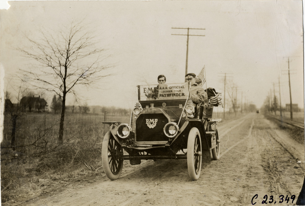 Dai Lewis and motorists in E-M-F automobile on rural road, 1909 Glidden pathfinding expedition
