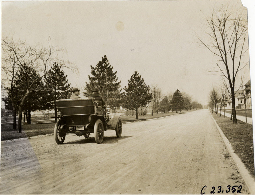 View of motorists in E-M-F car on residential street during the pathfinding expedition for the 1909 Glidden Tour. Handwritten on back: "Tours--Glidden Tour Pathfinder, 1909."
