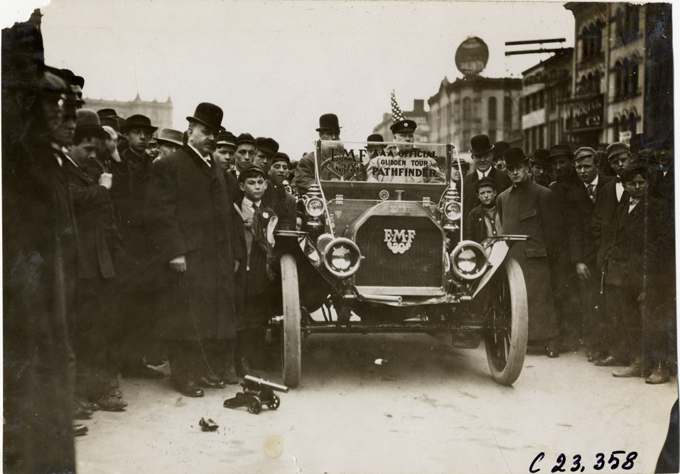 Crowd surrounding motorists in E-M-F automobile at Detroit, Michigan, 1909 Glidden pathfinding expedition