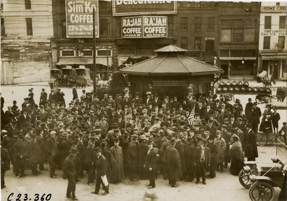 View of crowd surrounding motorists in E-M-F car in Cadillac Square, Detroit, Michigan during the pathfinding expedition for the 1909 Glidden Tour. Small octagonal building with tiled roof in background. Handwritten on back: "Cadillac Square, Detroit, Michigan. Tours--Glidden Tour Pathfinder, 1909."