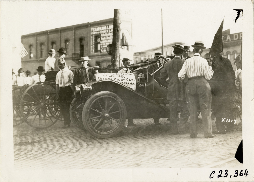 View of spectators surrounding Velie pilot car during the 1910 Glidden Tour. Commercial buildings in background. Stamped on back: "Spooner & Wells, Inc., photographers, telephone North 1745. 1231 Woodward Ave., Detroit, Mich. Detroit, 1231 Woodward, New York, 1931 Broadway." Handwritten on back: "Tours--Glidden Tour, 1910."