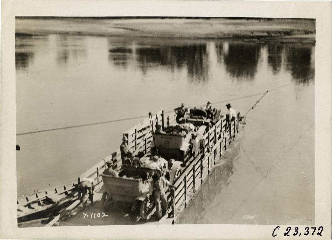 View of motorists with cars on barge, preparing to cross river, during the 1910 Glidden Tour. Stamped on back: "Spooner & Wells, Inc., photographers, telephone North 1745. 1231 Woodward Ave., Detroit, Mich. Detroit, 1231 Woodward, New York, 1931 Broadway." Handwritten on back: "Tours--Glidden Tour, 1910."