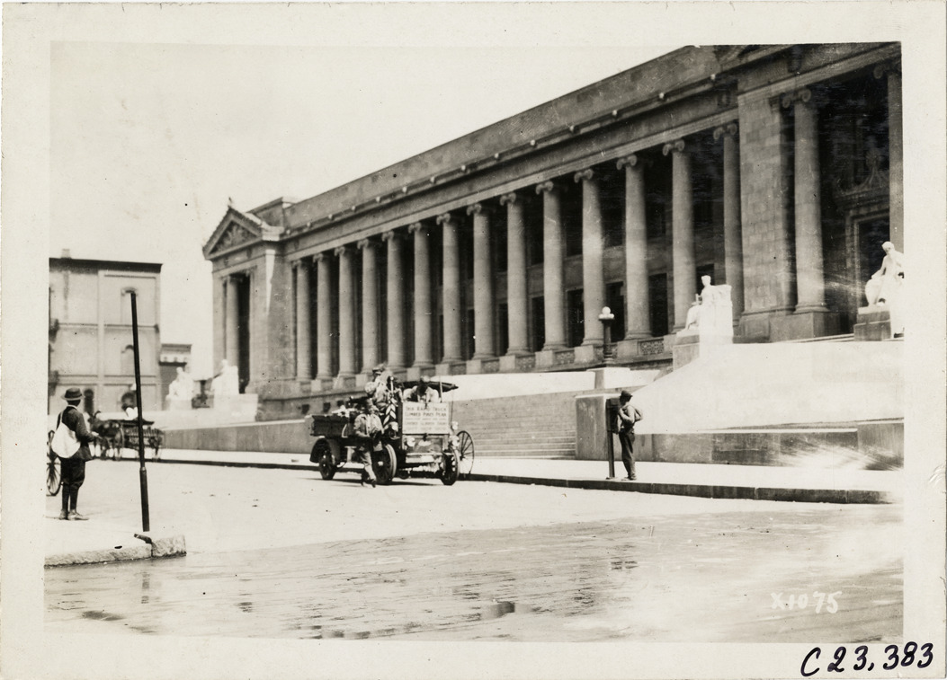 View of Rapid truck in front of Neoclassical style building during the 1910 Glidden Tour. Stone building has columns with Ionic capitals, steps and statuary on pedestals. Stamped on back: "Spooner & Wells, Inc., photographers, telephone North 1745. 1231 Woodward Ave., Detroit, Mich. Detroit, 1231 Woodward, New York, 1931 Broadway." Handwritten on back: "#107. Tours--Glidden Tour, 1910."