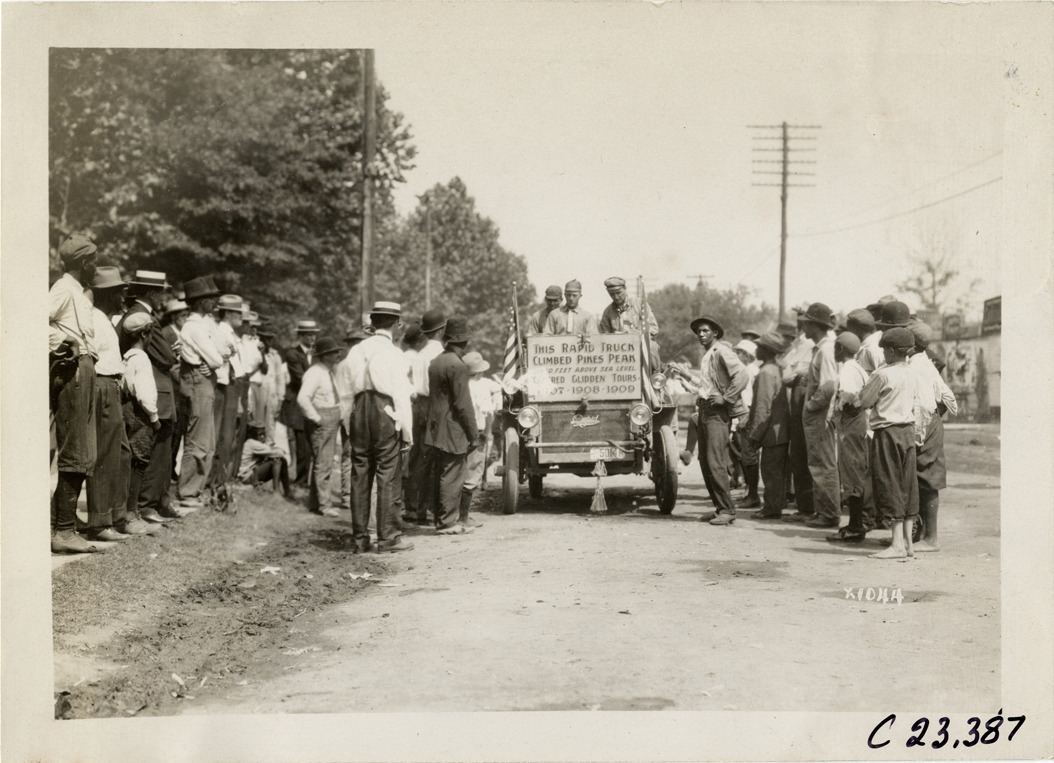 Favorite this☆ Spectators surrounding Rapid truck, 1910 Glidden Tour Description: View of crowd of spectators surrounding motorists in Rapid truck during the 1910 Glidden Tour. Sign on truck reads: "This Rapid truck climbed Pikes Peak, 15,000 feet above sea level covered Glidden Tours 1907, 1908, 1909." Stamped on back: "Spooner & Wells, Inc., photographers, telephone North 1745. 1231 Woodward Ave., Detroit, Mich. Detroit, 1231 Woodward, New York, 1931 Broadway." Handwritten on back: "Tours--Glidden Tour, 1910." Details Resource ID: na024617 Creator: Spooner & Wells Subject: Trucks Rapid Motor Truck Company Spectators Glidden Tour (1910) Automobile driving--Competitions--United States Photographers--Michigan--Detroit Photographic prints Date Issued: 1910 Format: 1 photographic print ; 5 x 7 in. Member of: National Automotive History Collection Lazarnick Collection Filing Location: Tours--Glidden Tour, 1910 #2 Negative Number: Negative #C23,387 Rights: Physical rights are retained by DPL. Copyright is retained in accordance with U.S. copyright laws.