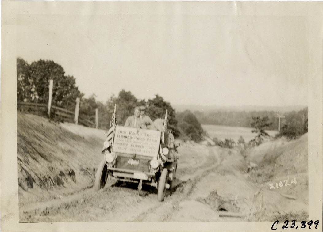 Favorite this☆ Motorists in Rapid truck traveling on rural road, 1910 Glidden Tour Description: View of motorists in Rapid truck traveling on rural dirt road during the 1910 Glidden Tour. Sign on truck reads: "This Rapid truck climbed Pikes Peak, 15,000 feet above sea level covered Glidden Tours 1907, 1908, 1909." Handwritten on back: "Tours--Glidden Tour, 1910." Details Resource ID: na024629 Subject: Trucks Rapid Motor Truck Company Rural roads Glidden Tour (1910) Automobile driving--Competitions--United States Photographic prints Date Issued: 1910 Format: 1 photographic print ; 5 x 7 in. Member of: National Automotive History Collection Lazarnick Collection Filing Location: Tours--Glidden Tour, 1910 #2 Negative Number: Negative #C23,399 Rights: Physical rights are retained by DPL. Copyright is retained in accordance with U.S. copyright laws.