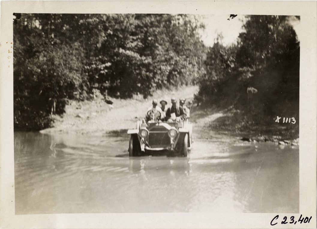 View of motorists in car crossing river during the 1910 Glidden Tour. Stamped on back: "Spooner & Wells, Inc., photographers, telephone North 1745. 1231 Woodward Ave., Detroit, Mich. Detroit, 1231 Woodward, New York, 1931 Broadway." Handwritten on back: "Tours--Glidden Tour, 1910."