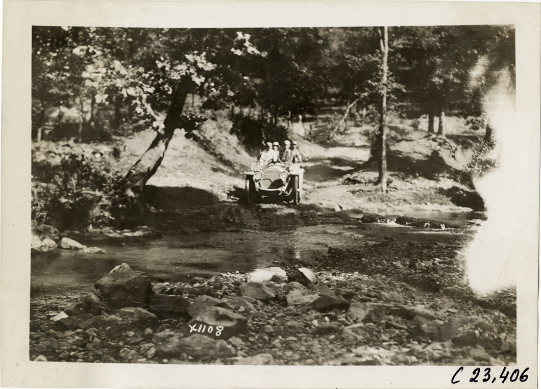 View of motorists in car approaching river or stream during the 1910 Glidden Tour. Stamped on back: "Spooner & Wells, Inc., photographers, telephone North 1745. 1231 Woodward Ave., Detroit, Mich. Detroit, 1231 Woodward, New York, 1931 Broadway." Handwritten on back: "Tours--Glidden Tour, 1910."
