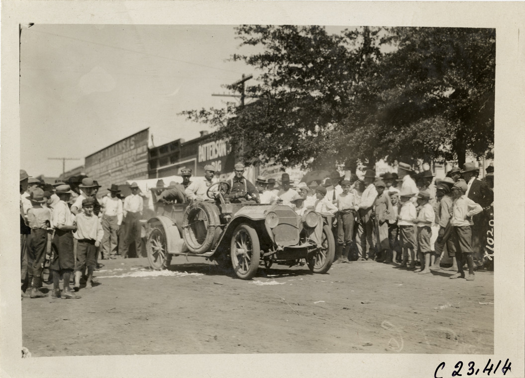View of spectators surrounding motorists in car during the 1910 Glidden Tour. Commercial buildings in background. Stamped on back: "Spooner & Wells, Inc., photographers, telephone North 1745. 1231 Woodward Ave., Detroit, Mich. Detroit, 1231 Woodward, New York, 1931 Broadway." Handwritten on back: "Tours--Glidden Tour, 1910."