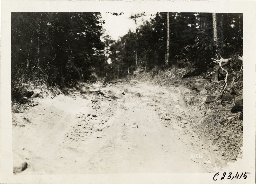 View of dirt road in forest during the 1910 Glidden Tour. Stamped on back: "Spooner & Wells, Inc., photographers, telephone North 1745. 1231 Woodward Ave., Detroit, Mich. Detroit, 1231 Woodward, New York, 1931 Broadway." Handwritten on back: "Tours--Glidden Tour, 1910."