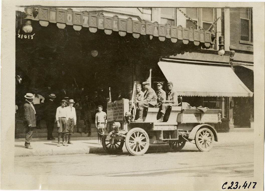 View of motorists posing in Rapid truck during the 1910 Glidden Tour. Sign on truck reads: "This Rapid truck climbed Pikes Peak, 15,000 feet above sea level covered Glidden Tours 1907, 1908, 1909." Spectators stand under building awning in background. Handwritten on back: "Tours--Glidden Tour, 1910."