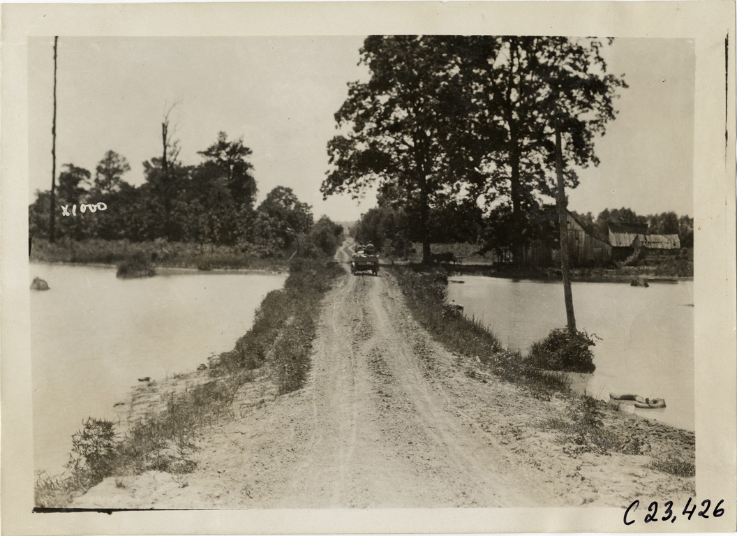 Rear view of motorists in Rapid truck traveling on rural dirt road during the 1910 Glidden Tour. Road crosses lake or pond. Handwritten on back: "Tours--Glidden Tour, 1910."