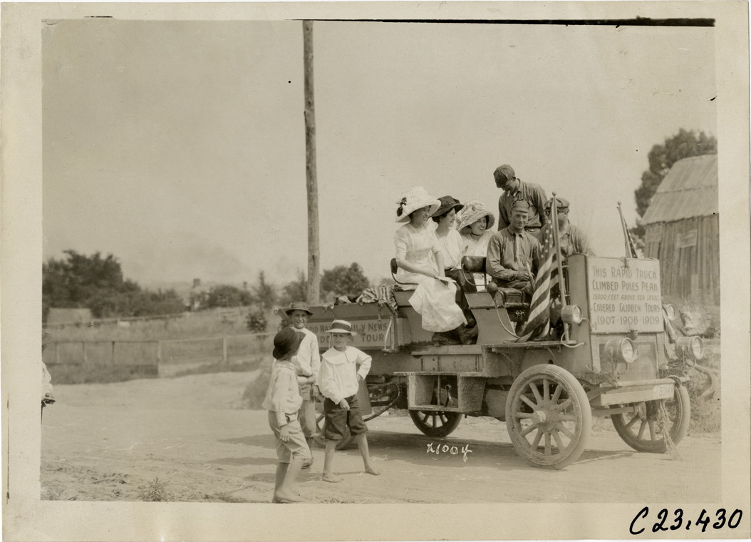 View of several women and boys posing with motorists in Rapid truck during the 1910 Glidden Tour. Sign on truck reads: "This Rapid truck climbed Pikes Peak, 15,000 feet above sea level covered Glidden Tours 1907, 1908, 1909." Handwritten on back: "Tours--Glidden Tour, 1910."