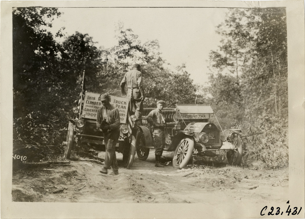 Favorite this☆ Motorists with Rapid truck and Reo checking automobile, 1910 Glidden Tour Description: View of motorists with Rapid truck and disabled Reo checking car on dirt road during the 1910 Glidden Tour. Sign on truck reads: "This Rapid truck climbed Pikes Peak, 15,000 feet above sea level covered Glidden Tours 1907, 1908, 1909." Handwritten on back: "Tours--Glidden Tour, 1910." Details Resource ID: na024661 Subject: Trucks Rapid Motor Truck Company Automobiles Reo Motor Car Company Glidden Tour (1910) Automobile driving--Competitions--United States Photographic prints Date Issued: 1910 Format: 1 photographic print ; 5 x 7 in. Member of: National Automotive History Collection Lazarnick Collection Filing Location: Tours--Glidden Tour, 1910 #3 Negative Number: Negative #C23,431 Rights: Physical rights are retained by DPL. Copyright is retained in accordance with U.S. copyright laws.