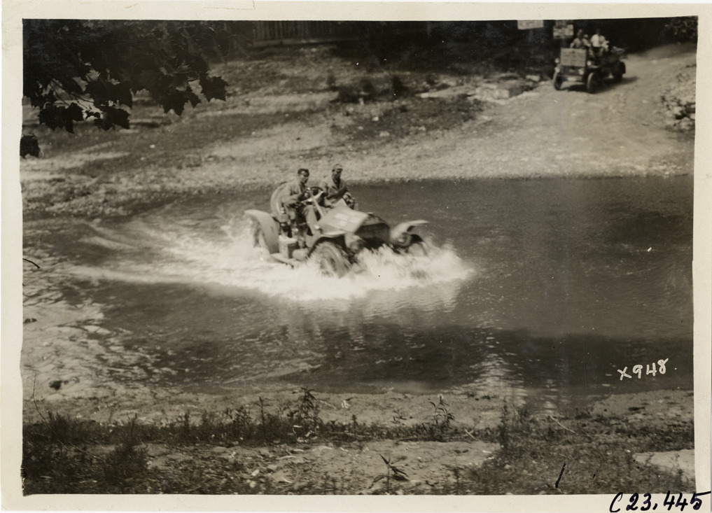 View of motorists in car crossing river during the 1910 Glidden Tour. Rapid truck in background. Stamped on back: "Spooner & Wells, Inc., photographers, telephone North 1745. 1231 Woodward Ave., Detroit, Mich. Detroit, 1231 Woodward, New York, 1931 Broadway." Handwritten on back: "Tours--Glidden Tour, 1910."