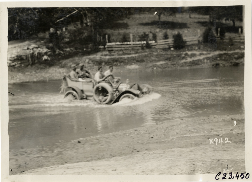 View of motorists in car crossing river during the 1910 Glidden Tour. Stamped on back: "Spooner & Wells, Inc., photographers, telephone North 1745. 1231 Woodward Ave., Detroit, Mich. Detroit, 1231 Woodward, New York, 1931 Broadway." Handwritten on back: "Tours--Glidden Tour, 1910."