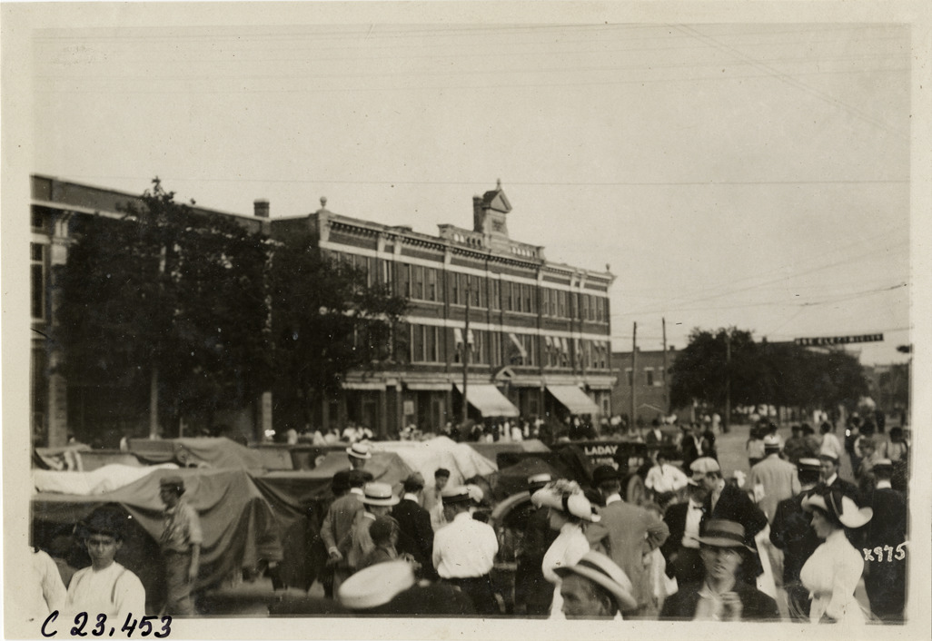 View of crowd surrounding cars in street during the 1910 Glidden Tour. Cars are covered with tarpaulins; commercial buildings in background. Stamped on back: "Spooner & Wells, Inc., photographers, telephone North 1745. 1231 Woodward Ave., Detroit, Mich. Detroit, 1231 Woodward, New York, 1931 Broadway." Handwritten on back: "Tours--Glidden Tour, 1910."
