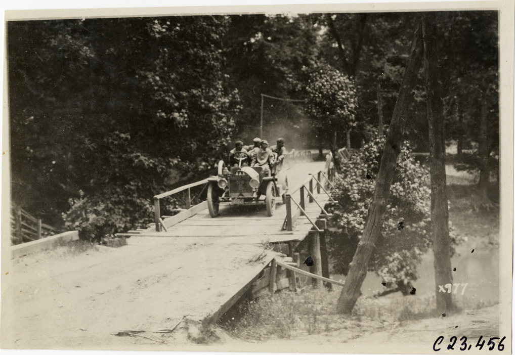 View of motorists in Cole car no. 6 crossing a wooden bridge during the 1910 Glidden Tour. Stamped on back: "Spooner & Wells, Inc., photographers, telephone North 1745. 1231 Woodward Ave., Detroit, Mich. Detroit, 1231 Woodward, New York, 1931 Broadway." Handwritten on back: "Tours--Glidden Tour, 1910."