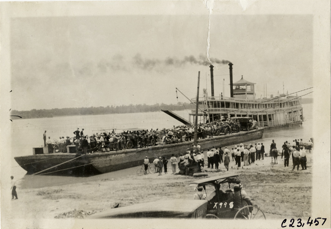 View of motorists with cars on barge during the 1910 Glidden Tour. Steamboat in background; spectators on shore. Stamped on back: "Spooner & Wells, Inc., photographers, telephone North 1745. 1231 Woodward Ave., Detroit, Mich. Detroit, 1231 Woodward, New York, 1931 Broadway." Handwritten on back: "Tours--Glidden Tour, 1910."