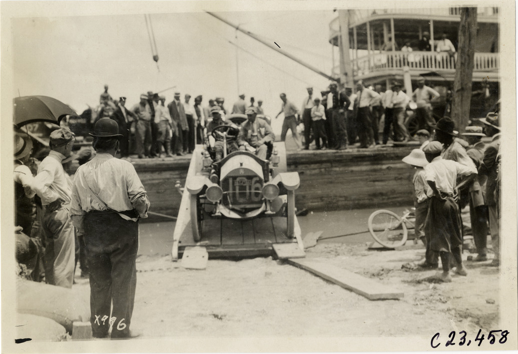 View of motorists driving Falcar no. 106 on ramp from barge during the 1910 Glidden Tour. Steamboat in background; spectators on shore. Stamped on back: "Spooner & Wells, Inc., photographers, telephone North 1745. 1231 Woodward Ave., Detroit, Mich. Detroit, 1231 Woodward, New York, 1931 Broadway." Handwritten on back: "Tours--Glidden Tour, 1910."