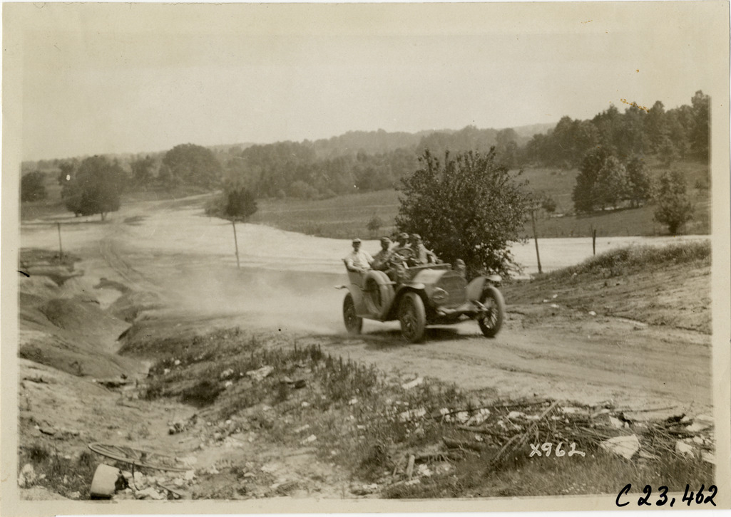View of motorists in car traveling on rural dirt road during the 1910 Glidden Tour. Stamped on back: "Spooner & Wells, Inc., photographers, telephone North 1745. 1231 Woodward Ave., Detroit, Mich. Detroit, 1231 Woodward, New York, 1931 Broadway." Handwritten on back: "Tours--Glidden Tour, 1910."