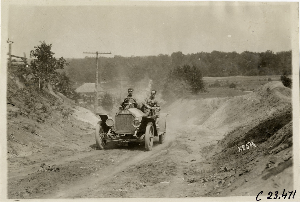 View of motorists in car traveling on rural dirt road during the 1910 Glidden Tour. Stamped on back: "Spooner & Wells, Inc., photographers, telephone North 1745. 1231 Woodward Ave., Detroit, Mich. Detroit, 1231 Woodward, New York, 1931 Broadway." Handwritten on back: "Tours--Glidden Tour, 1910."