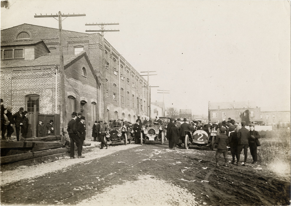View of spectators and motorists surrounding cars in front of the Ajax-Grieb Rubber Company factory at Trenton, New Jersey during the 1909 New York to Philadelphia Run sponsored by the Women's Motoring Club. Stamped on back: "Photo by N. Lazarnick, 29 West 42nd Street, N.Y., tel. 594 Bryant." Handwritten on back: "Contestants stopping at Ajax Grieb factory, Trenton. Tours--Women's New York to Philadelphia Run, 1909."