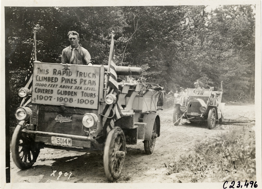 View of motorists in Rapid truck towing Cutting "40" car on dirt road during the 1910 Glidden Tour. Sign on truck reads: "This Rapid truck climbed Pikes Peak, 15,000 feet above sea level covered Glidden Tours 1907, 1908, 1909." Stamped on back: "Spooner & Wells, Inc., photographers, telephone North 1745. 1231 Woodward Ave., Detroit, Mich. Detroit, 1231 Woodward, New York, 1931 Broadway." Handwritten on back: "Tours--Glidden Tour, 1910."