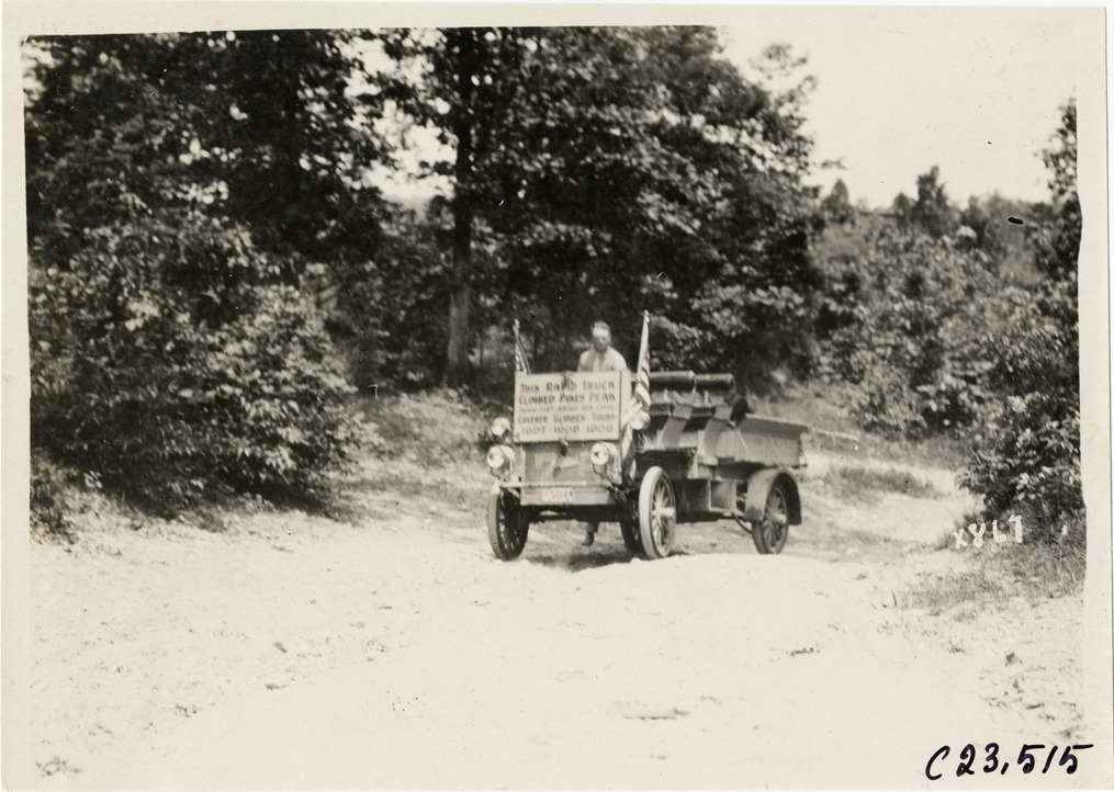 Favorite this☆ Motorist in Rapid truck traveling on rural road, 1910 Glidden Tour Description: View of motorist in Rapid truck traveling on rural dirt road during the 1910 Glidden Tour. Sign on truck reads: "This Rapid truck climbed Pikes Peak, 15,000 feet above sea level covered Glidden Tours 1907, 1908, 1909." Stamped on back: "Spooner & Wells, Inc., photographers, telephone North 1745. 1231 Woodward Ave., Detroit, Mich. Detroit, 1231 Woodward, New York, 1931 Broadway." Handwritten on back: "Tours--Glidden Tour, 1910." Details Resource ID: na024746 Creator: Spooner & Wells Subject: Trucks Rapid Motor Truck Company Rural roads Glidden Tour (1910) Automobile driving--Competitions--United States Photographers--Michigan--Detroit Photographic prints Date Issued: 1910 Format: 1 photographic print ; 4.75 x 6.75 in. Member of: National Automotive History Collection Lazarnick Collection Filing Location: Tours--Glidden Tour, 1910 #7 Negative Number: Negative #C23,515 Rights: Physical rights are retained by DPL. Copyright is retained in accordance with U.S. copyright laws.