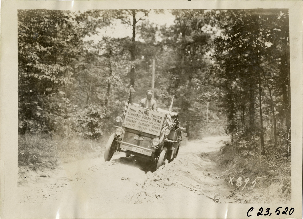 View of motorist in Rapid truck traveling on uneven dirt road during the 1910 Glidden Tour. Sign on truck reads: "This Rapid truck climbed Pikes Peak, 15,000 feet above sea level covered Glidden Tours 1907, 1908, 1909." Handwritten on back: "Tours--Glidden Tour, 1910."