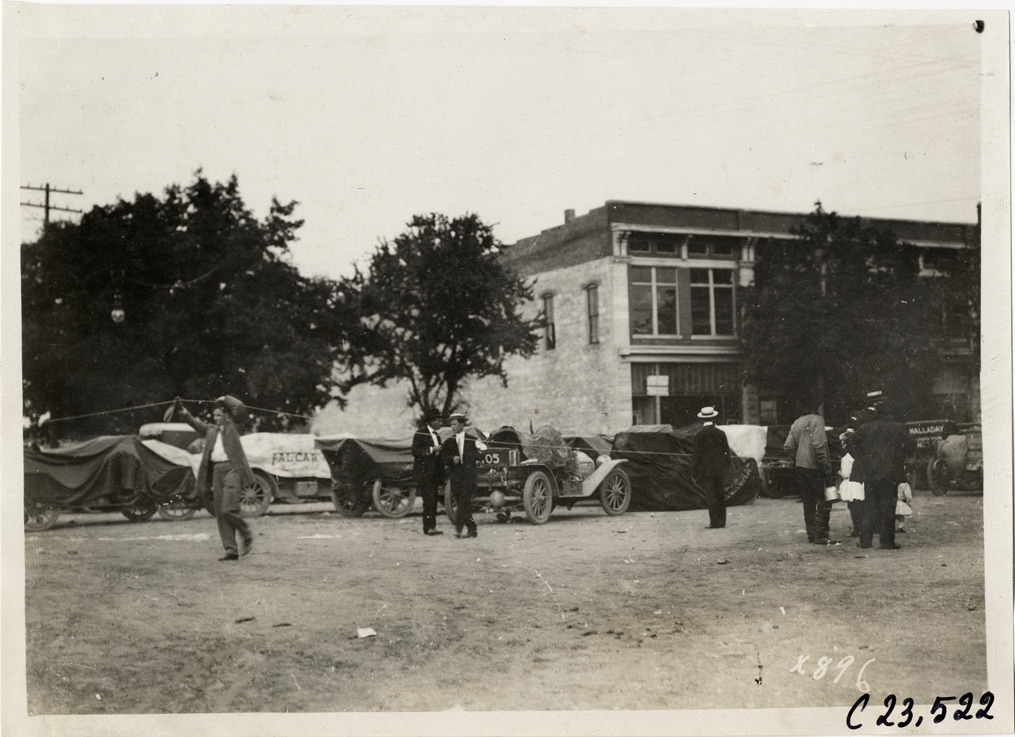 Automobiles parked in cordoned-off area in street, 1910 Glidden Tour
