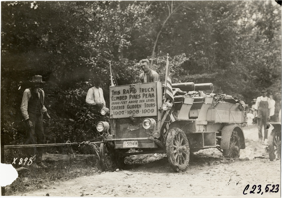 Favorite this☆ Rapid truck being towed out of muddy road, 1910 Glidden Tour Description: View of Rapid truck being towed out of muddy rural road during the 1910 Glidden Tour. Sign on truck reads: "This Rapid truck climbed Pikes Peak, 15,000 feet above sea level covered Glidden Tours 1907, 1908, 1909." Onlookers stand nearby. Stamped on back: "Spooner & Wells, Inc., photographers, telephone North 1745. 1231 Woodward Ave., Detroit, Mich. Detroit, 1231 Woodward, New York, 1931 Broadway." Handwritten on back: "Tours--Glidden Tour, 1910." Details Resource ID: na024754 Creator: Spooner & Wells Subject: Trucks--Towing Rapid Motor Truck Company Dirt roads Glidden Tour (1910) Automobile driving--Competitions--United States Photographers--Michigan--Detroit Photographic prints Date Issued: 1910 Format: 1 photographic print ; 4.5 x 6.5 in. Member of: National Automotive History Collection Lazarnick Collection Filing Location: Tours--Glidden Tour, 1910 #7 Negative Number: Negative #C23,523 Rights: Physical rights are retained by DPL. Copyright is retained in accordance with U.S. copyright laws.
