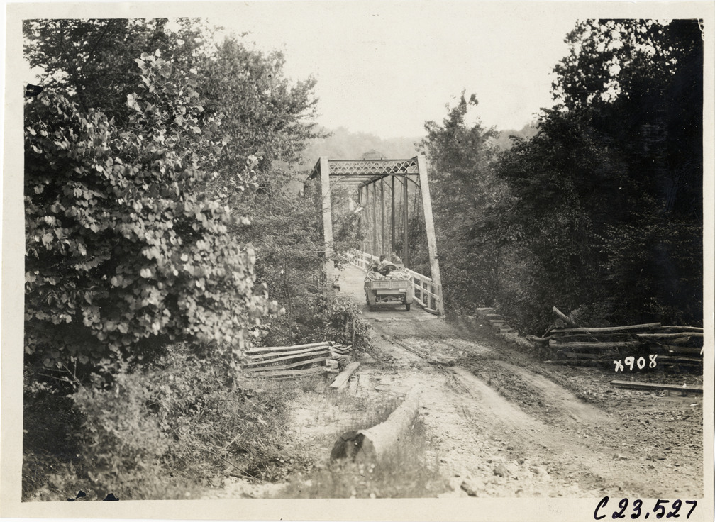 Rear view of motorists in Rapid truck crossing a bridge during the 1910 Glidden Tour. Stamped on back: "Spooner & Wells, Inc., photographers, telephone North 1745. 1231 Woodward Ave., Detroit, Mich. Detroit, 1231 Woodward, New York, 1931 Broadway." Handwritten on back: "Tours--Glidden Tour, 1910."