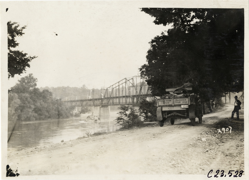 Rear view of motorists in Rapid truck approaching a bridge during the 1910 Glidden Tour. Sign on back of truck reads: "Publication Office, Glidden Tour, 1910." Stamped on back: "Spooner & Wells, Inc., photographers, telephone North 1745. 1231 Woodward Ave., Detroit, Mich. Detroit, 1231 Woodward, New York, 1931 Broadway." Handwritten on back: "Tours--Glidden Tour, 1910."
