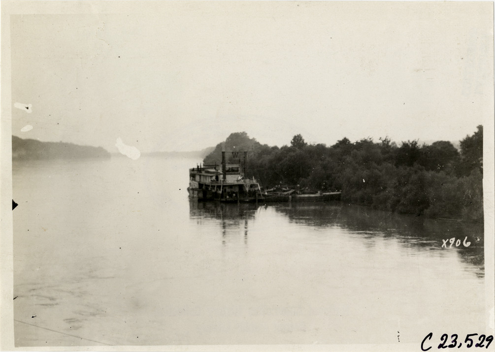 Distant view of steamboat in river during the 1910 Glidden Tour. Stamped on back: "Spooner & Wells, Inc., photographers, telephone North 1745. 1231 Woodward Ave., Detroit, Mich. Detroit, 1231 Woodward, New York, 1931 Broadway." Handwritten on back: "Tours--Glidden Tour, 1910."