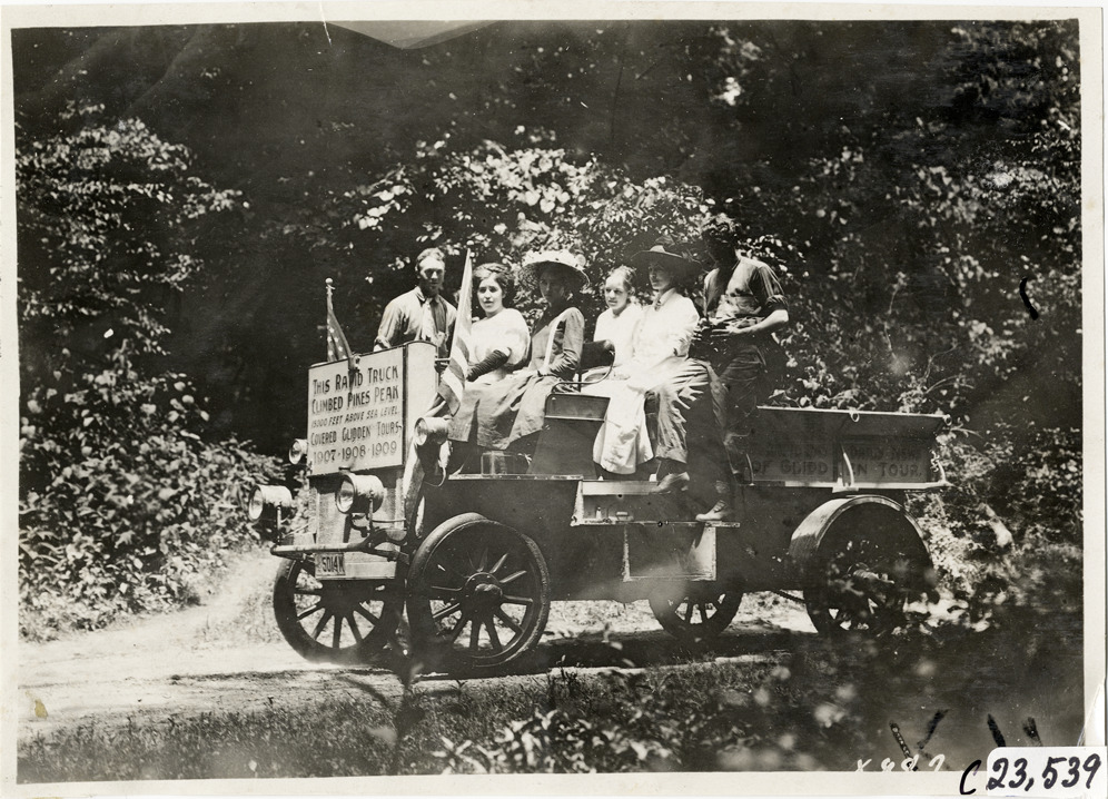 View of women posing with motorists in Rapid truck on rural dirt road during the 1910 Glidden Tour. Sign on truck reads: "This Rapid truck climbed Pikes Peak, 15,000 feet above sea level covered Glidden Tours 1907, 1908, 1909." Stamped on back: "Spooner & Wells, Inc., photographers, telephone North 1745. 1231 Woodward Ave., Detroit, Mich. Detroit, 1231 Woodward, New York, 1931 Broadway." Handwritten on back: "Tours--Glidden Tour, 1910."