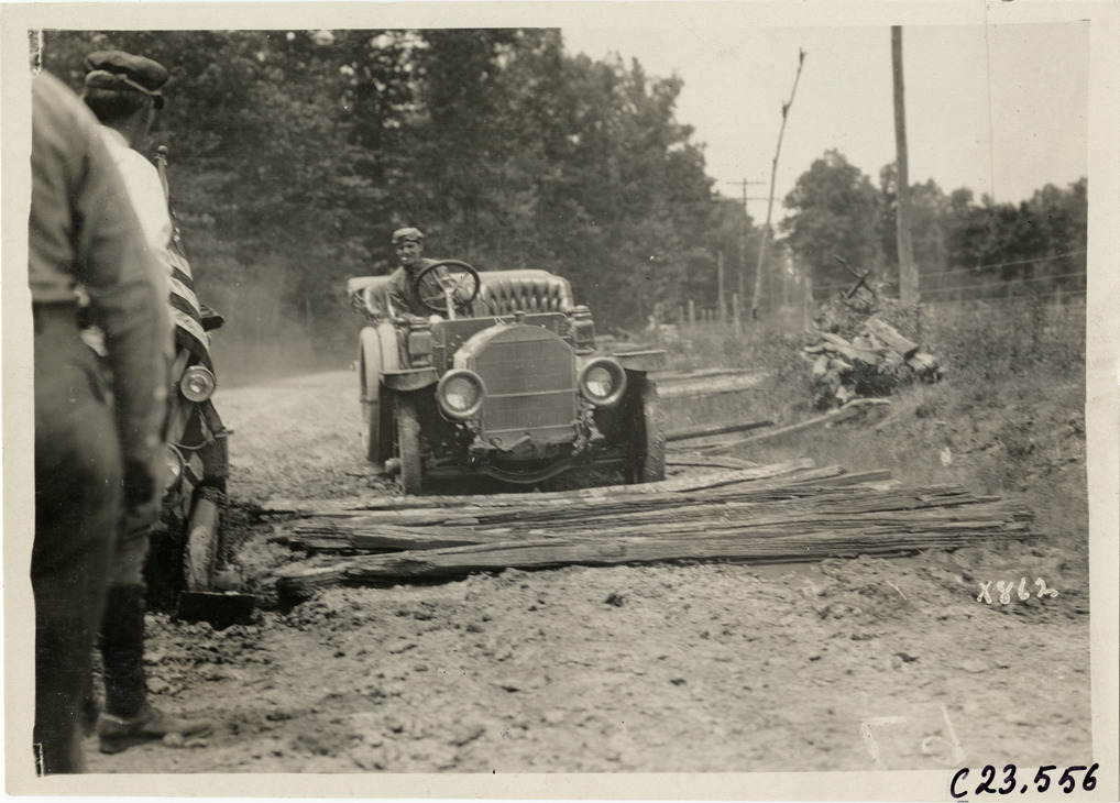 View of motorist driving car over boards on muddy rural road during the 1910 Glidden Tour. Stamped on back: "Spooner & Wells, Inc., photographers, telephone North 1745. 1231 Woodward Ave., Detroit, Mich. Detroit, 1231 Woodward, New York, 1931 Broadway." Handwritten on back: "Tours--Glidden Tour, 1910."