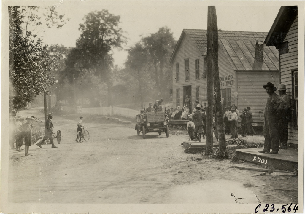 Favorite this☆ Motorists in Rapid truck greeting spectators in front of commercial buildings, 1910 Glidden Tour Description: View of motorists in Rapid truck greeting spectators in front of wooden-frame commercial buildings during the 1910 Glidden Tour. Sign on truck reads: "This Rapid truck climbed Pikes Peak, 15,000 feet above sea level covered Glidden Tours 1907, 1908, 1909." Stamped on back: "Spooner & Wells, Inc., photographers, telephone North 1745. 1231 Woodward Ave., Detroit, Mich. Detroit, 1231 Woodward, New York, 1931 Broadway." Handwritten on back: "Tours--Glidden Tour, 1910." Details Resource ID: na024796 Creator: Spooner & Wells Subject: Trucks Rapid Motor Truck Company Spectators Commercial buildings Glidden Tour (1910) Automobile driving--Competitions--United States Photographers--Michigan--Detroit Photographic prints Date Issued: 1910 Format: 1 photographic print ; 5 x 6.75 in. Member of: National Automotive History Collection Lazarnick Collection Filing Location: Tours--Glidden Tour, 1910 #9 Negative Number: Negative #C23,564 Rights: Physical rights are retained by DPL. Copyright is retained in accordance with U.S. copyright laws.