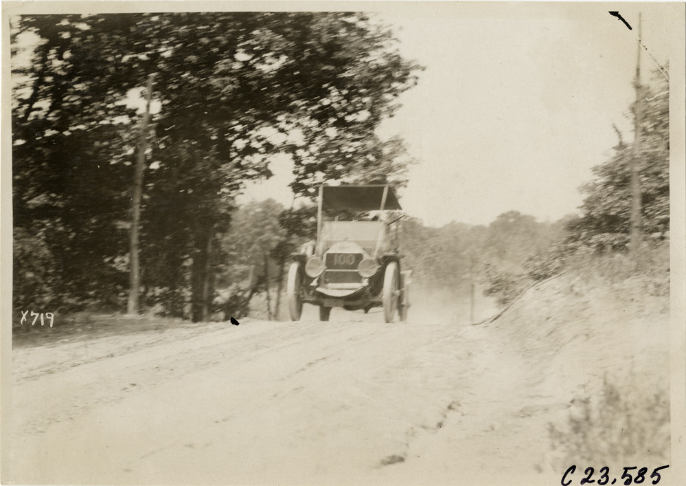 View of motorists in Moline car no. 100 traveling on rural dirt road during the 1910 Glidden Tour. Stamped on back: "Spooner & Wells, Inc., photographers, telephone North 1745. 1231 Woodward Ave., Detroit, Mich. Detroit, 1231 Woodward, New York, 1931 Broadway." Handwritten on back: "Tours--Glidden Tour, 1910."