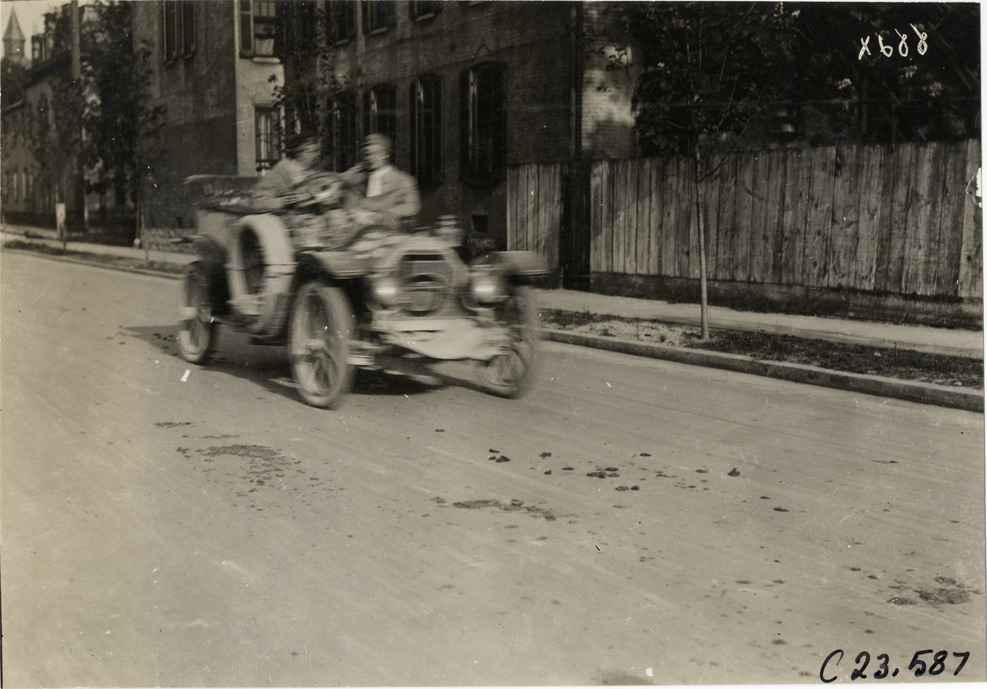 View of motorists in Chalmers car no. 5 during the 1910 Glidden Tour. Residential buildings and fence in background. Stamped on back: "Spooner & Wells, Inc., photographers, telephone North 1745. 1231 Woodward Ave., Detroit, Mich. Detroit, 1231 Woodward, New York, 1931 Broadway." Handwritten on back: "Tours--Glidden Tour, 1910."