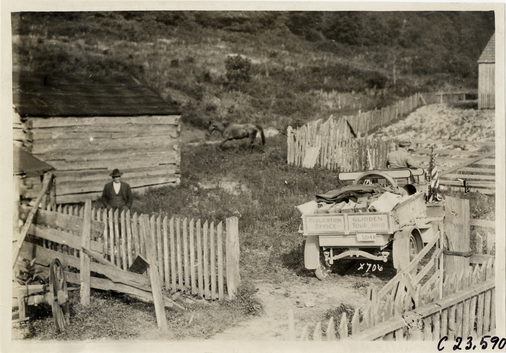 View of Rapid truck parked in farmyard during the 1910 Glidden Tour. Wooden-frame building, fenced enclosures and horse in background. Stamped on back: "Spooner & Wells, Inc., photographers, telephone North 1745. 1231 Woodward Ave., Detroit, Mich. Detroit, 1231 Woodward, New York, 1931 Broadway." Handwritten on back: "Tours--Glidden Tour, 1910."