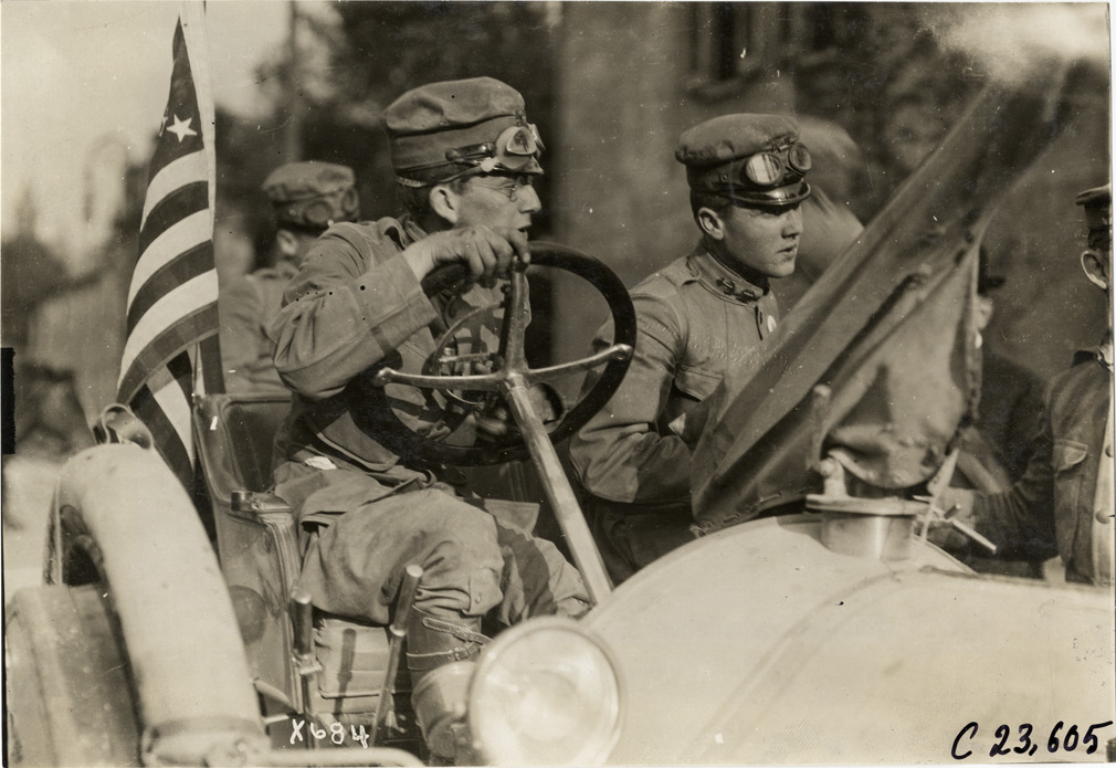 Close-up view of driver and passenger in car during the 1910 Glidden Tour. Stamped on back: "Spooner & Wells, Inc., photographers, telephone North 1745. 1231 Woodward Ave., Detroit, Mich. Detroit, 1231 Woodward, New York, 1931 Broadway." Handwritten on back: "Tours--Glidden Tour, 1910."