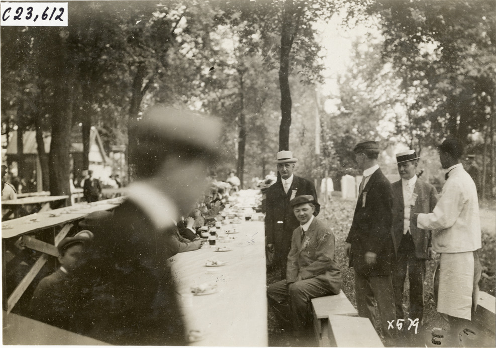 View of several men sitting at outdoor table for picnic during the 1910 Glidden Tour. Tables are set with tablecloths and place settings. Stamped on back: "Spooner & Wells, Inc., photographers, telephone North 1745. 1231 Woodward Ave., Detroit, Mich. Detroit, 1231 Woodward, New York, 1931 Broadway." Handwritten on back: "Tours--Glidden Tour, 1910."