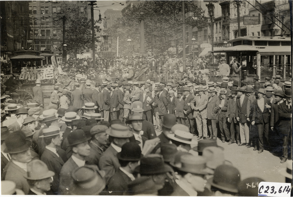 View of crowd of spectators in street during the 1910 Glidden Tour. Streetcar is partially visible on right; commercial buildings in background. Stamped on back: "Spooner & Wells, Inc., photographers, telephone North 1745. 1231 Woodward Ave., Detroit, Mich. Detroit, 1231 Woodward, New York, 1931 Broadway." Handwritten on back: "Tours--Glidden Tour, 1910."