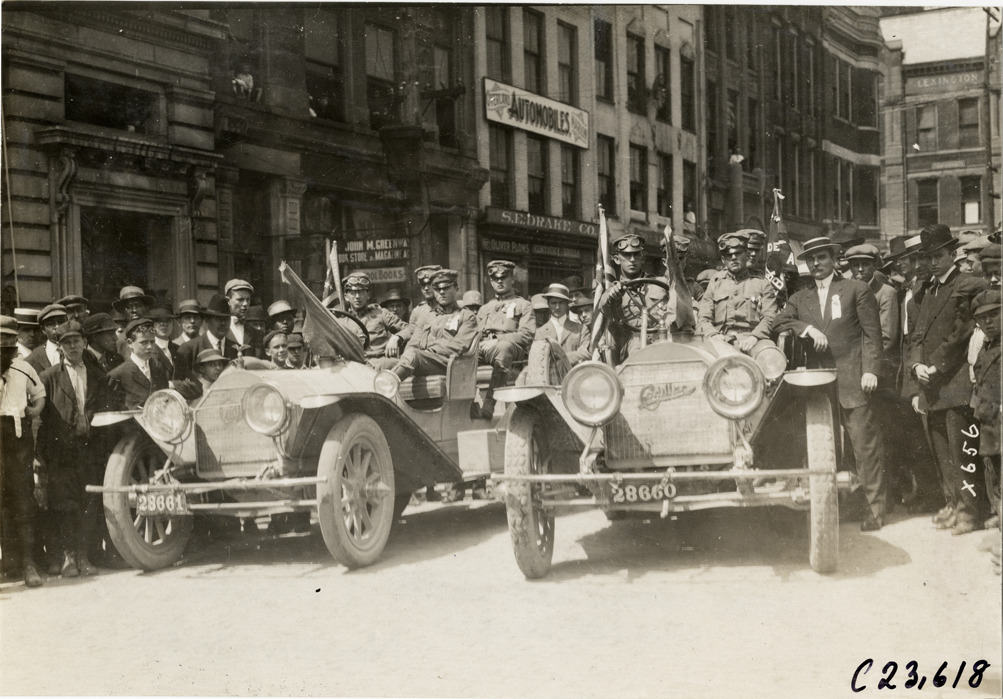 View of motorists in two Cadillac cars, surrounded by spectators, during the 1910 Glidden Tour. Commercial buildings in background. Stamped on back: "Spooner & Wells, Inc., photographers, telephone North 1745. 1231 Woodward Ave., Detroit, Mich. Detroit, 1231 Woodward, New York, 1931 Broadway." Handwritten on back: "Tours--Glidden Tour, 1910."