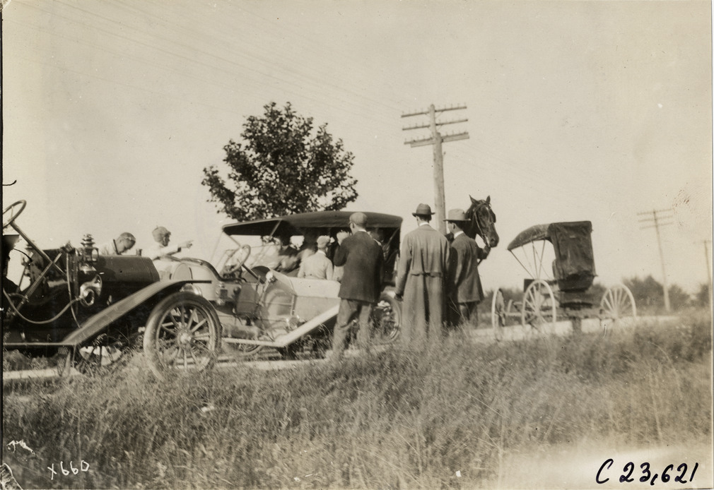 View of men standing with cars and horse-drawn carriage on roadside during the 1910 Glidden Tour. Stamped on back: "Spooner & Wells, Inc., photographers, telephone North 1745. 1231 Woodward Ave., Detroit, Mich. Detroit, 1231 Woodward, New York, 1931 Broadway." Handwritten on back: "Tours--Glidden Tour, 1910."