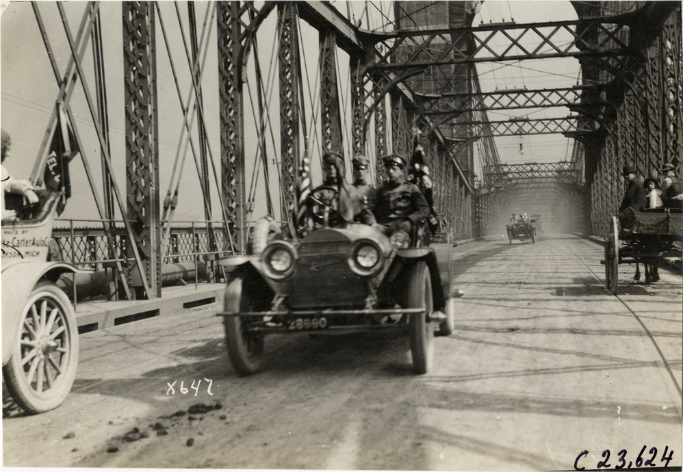 View of motorists in Cadillac car crossing bridge during the 1910 Glidden Tour. Car and horse-drawn wagon in background. Stamped on back: "Spooner & Wells, Inc., photographers, telephone North 1745. 1231 Woodward Ave., Detroit, Mich. Detroit, 1231 Woodward, New York, 1931 Broadway." Handwritten on back: "Tours--Glidden Tour, 1910."