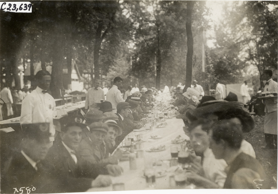 View of men, women and children sitting at long tables at picnic during the 1910 Glidden Tour. Waiters stand nearby; tables are set with tablecloths and place settings. Stamped on back: "Spooner & Wells, Inc., photographers, telephone North 1745. 1231 Woodward Ave., Detroit, Mich. Detroit, 1231 Woodward, New York, 1931 Broadway." Handwritten on back: "Tours--Glidden Tour, 1910."