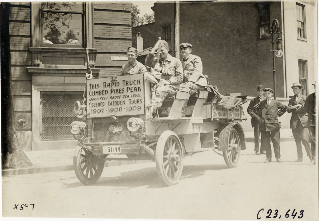 View of motorists posing in Rapid truck in front of the Julian & Kokenge Co. building, located on E. Fourth Street, during the 1910 Glidden Tour. Sign on truck reads: "This Rapid truck climbed Pikes Peak, 15,000 feet above sea level covered Glidden Tours 1907, 1908, 1909." Spectators stand in street. Stamped on back: "Spooner & Wells, Inc., photographers, telephone North 1745. 1231 Woodward Ave., Detroit, Mich. Detroit, 1231 Woodward, New York, 1931 Broadway." Handwritten on back: "Tours--Glidden Tour, 1910."